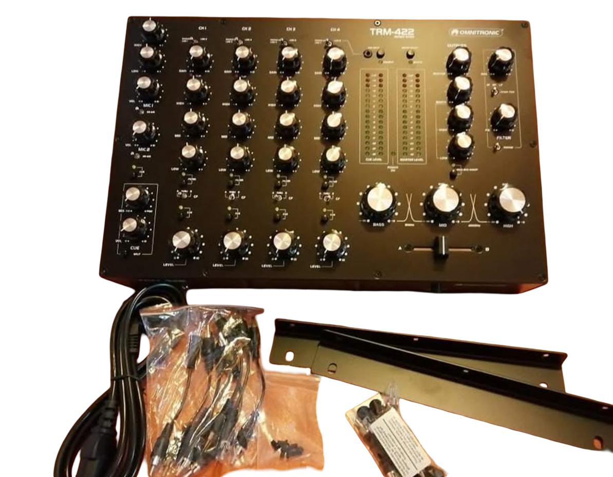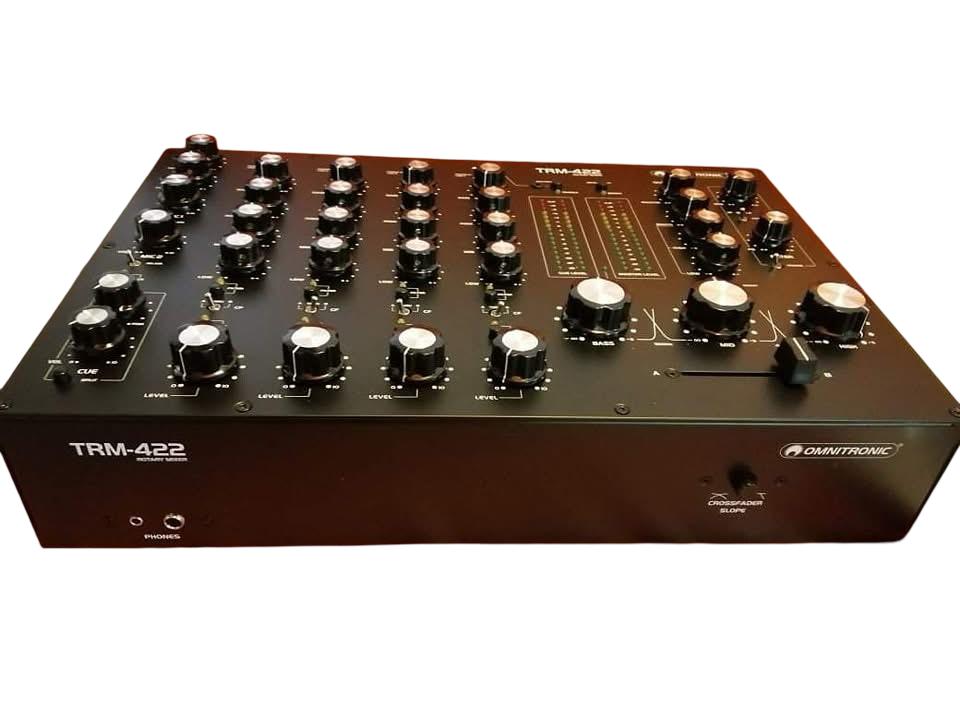 The Omnitronic TRM-422 is a professional 4-channel rotary mixer designed for DJs who value smooth transitions, warm analog sound, and classic rotary mixing. Featuring precise 3-band isolators, high-quality components, and a solid build, this mixer delivers outstanding sound quality for clubs, bars, and home setups.